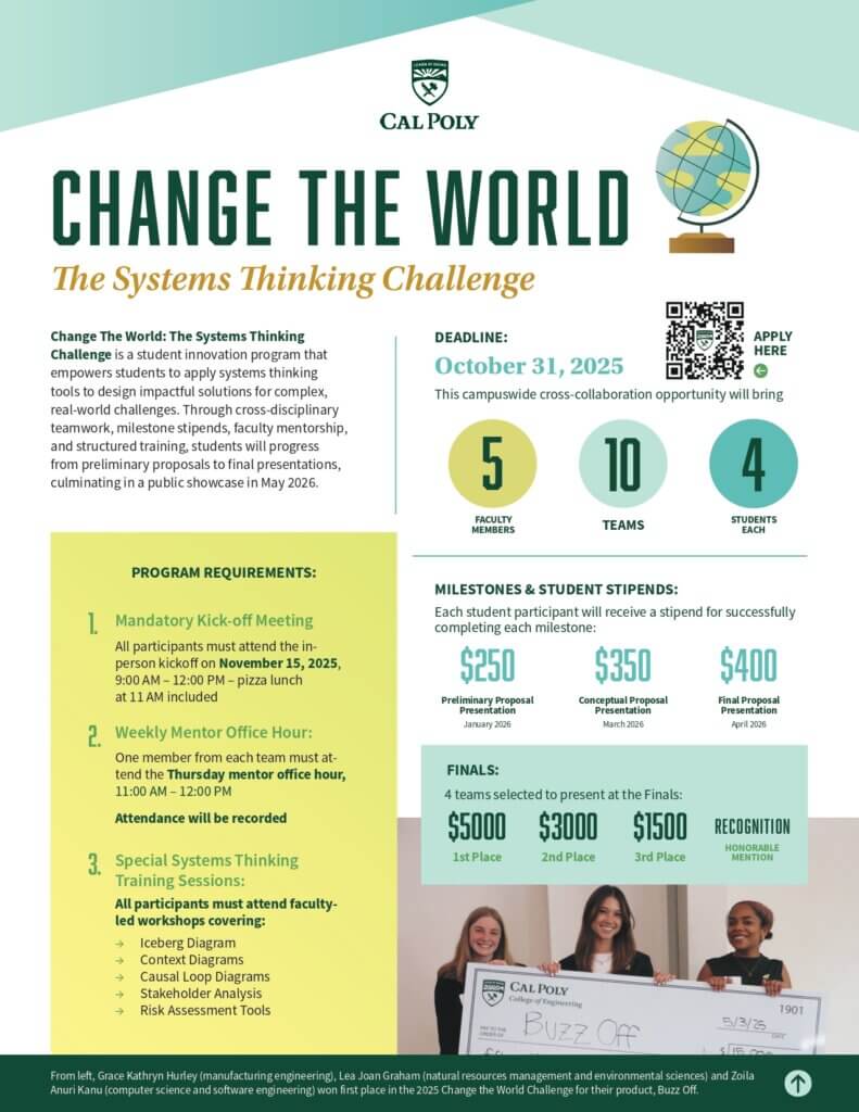 I direct a GE class in Fall where we collaboratively find solutions with partners in underserved communities (mostly in Africa). I am happy to accommodate minor schedule conflicts and lack of prerequisites. If you have any questions, please Email me (pschwart@calpoly.edu). Please see the flyer and forward it liberally!